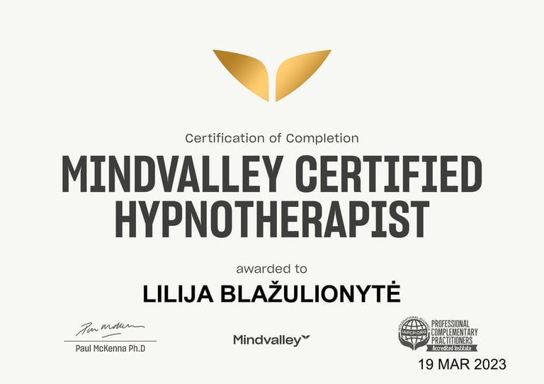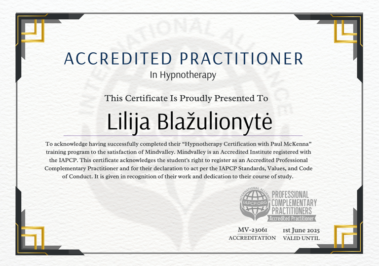 Lily Blaze is a certified hypnotherapist who has had the honor of working with renowned experts in the field. She has trained with the world's number one hypnotherapist, PhD Paul McKenna, as well as NLP Master Trainers Tina Tailor and Steve Crabb, who were trained by Dr. Richard Bandler himself, the co-creator of NLP. In addition to her extensive training in hypnotherapy and NLP, Lily has also obtained a certification in Evercoach business coaching. This allows her to not only provide individual coaching to her clients, but also corporate coaching services. Lily is accredited with the International Alliance of Professional Complementary Practitioners (IAPCP), which is a global collective of healthcare professionals dedicated to promoting best complementary practices. Their mission is to support people's mental, physical, and spiritual health worldwide and be the change they want to see in the world.